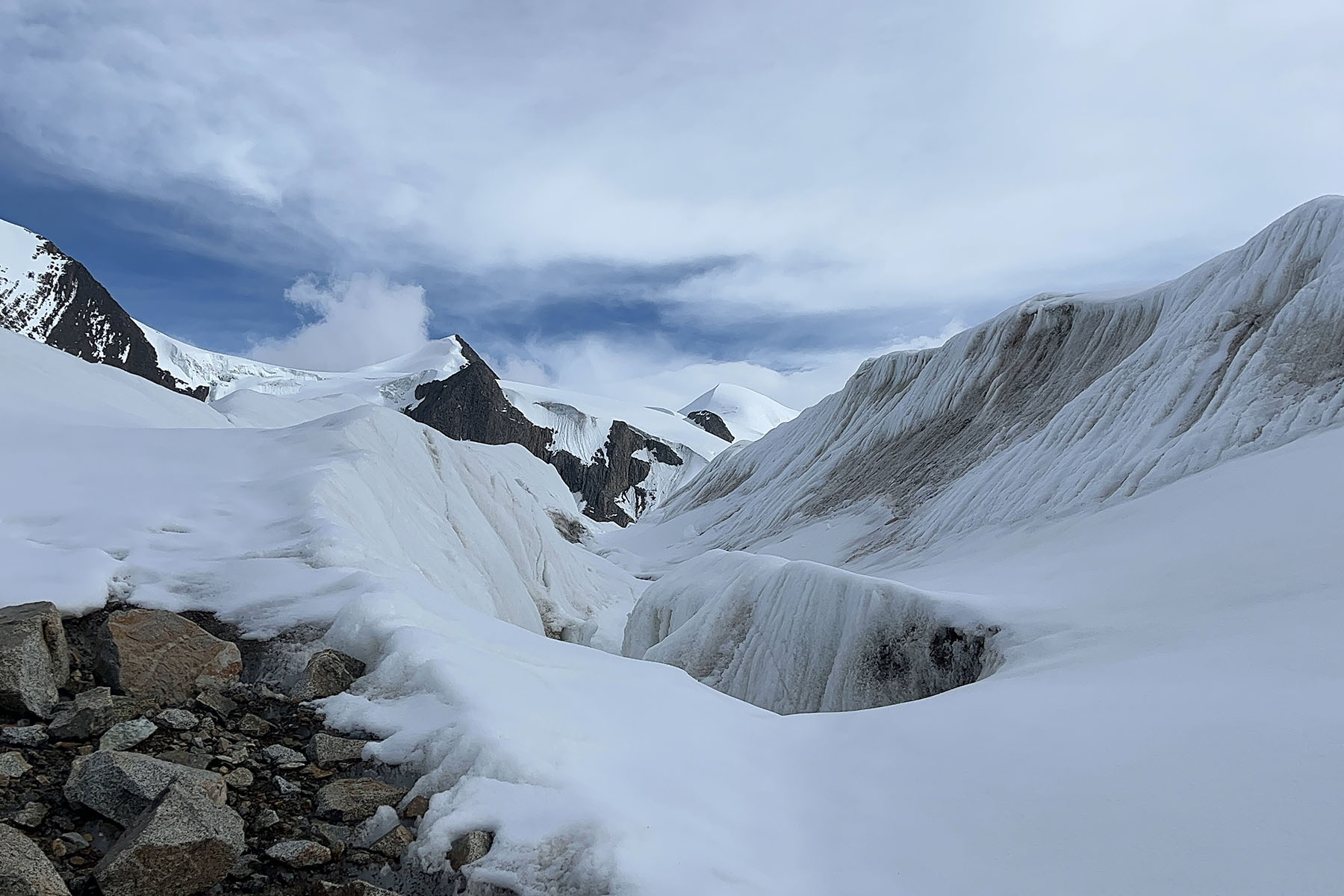 Today we will push further and higher to C1 to 5300m in 4km on glacier for around 4-6 hours. From base camp we should start to see the giant glacier and glacier towers of Zhongshan. We will be walking by the rocky terrain near the glacier for around 3km before traverse onto the glacier. We’ll rope in while walking on the glacier. The first 2-3km from base to the glacier can be the most challenging part of this climb due to its many rocks. C1 is also near glacier where we have chance to see the amazing glaciers of Mozi.