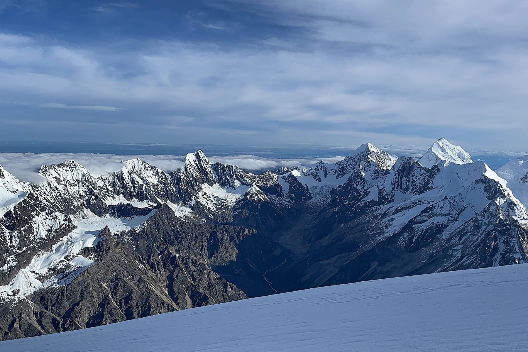 Today we will go from camp to the summit in around 6 hours for 3km ascending nearly 600m. We will need to start very early after midnight. After a mild ascent we will encounter the steeper part that leads to the summit where we need to rope in or use ropes and ascender. As we getting close to the summit the views are getting more and more amazing. After a short stay by the summit go back to C3.